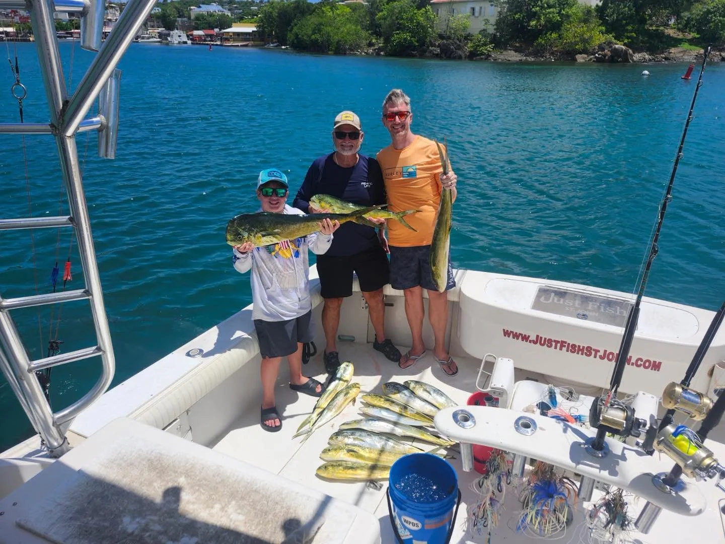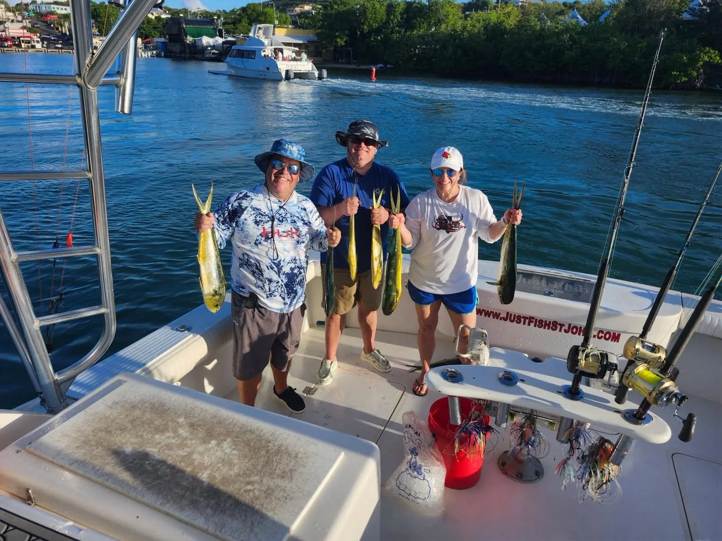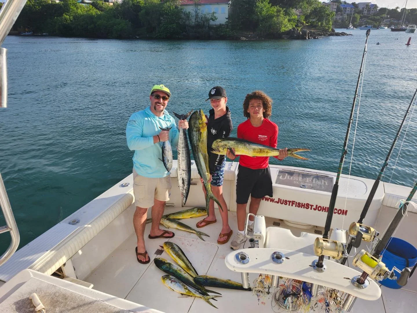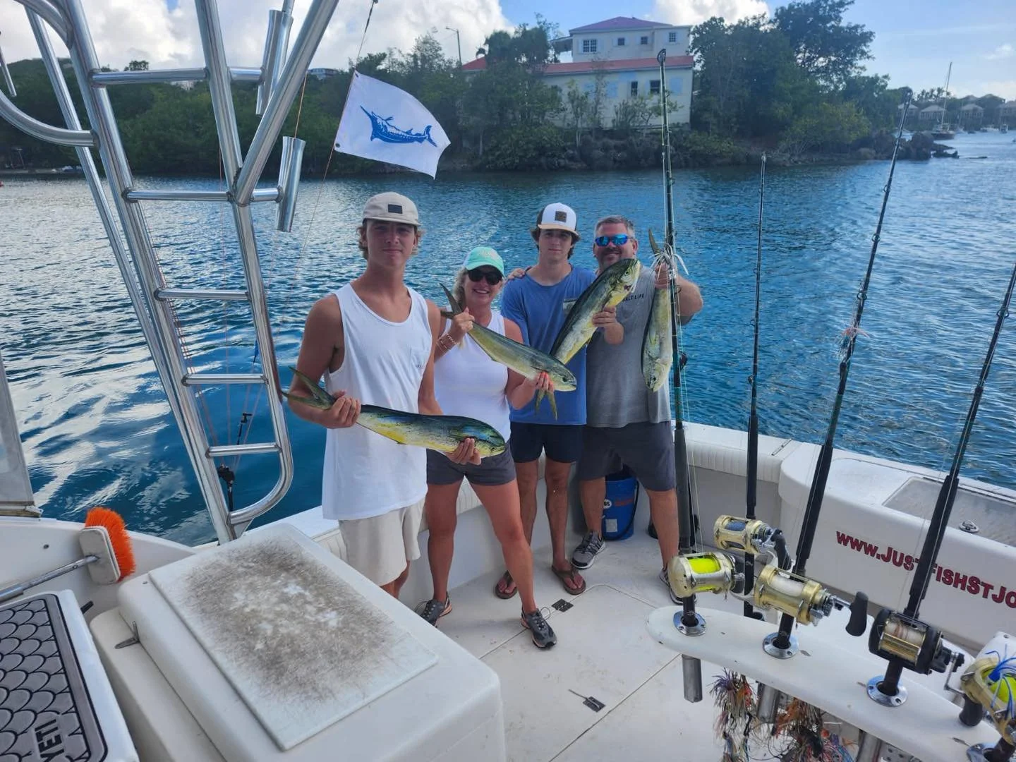 Come out and enjoy a great day of fishing with St. John's most highly recommended fishing charter boat company βJust Fish St. John.β We specialize in trolling for big game fish such as Blue Marlin, White Marlin, Sailfish, Yellowfin Tuna, Mahi-Mahi, and Wahoo. We also offer St. John inshore fishing charters that target bonito, barracuda, rainbow runner, yellow tail snapper, kingfish, and sharks that are swimming in the area. We are a family friendly St. John fishing charter and also welcome aboard serious anglers looking to fight big fish! All fishing boats offer plenty of comfortable dry and shaded seating for up to 6 anglers. We are fully equipped with all of the top-of-the-line fishing gear and equipment required for a successful day on the water catching quality fish. Please give us a call today to book your next St. John sportfishing adventure.